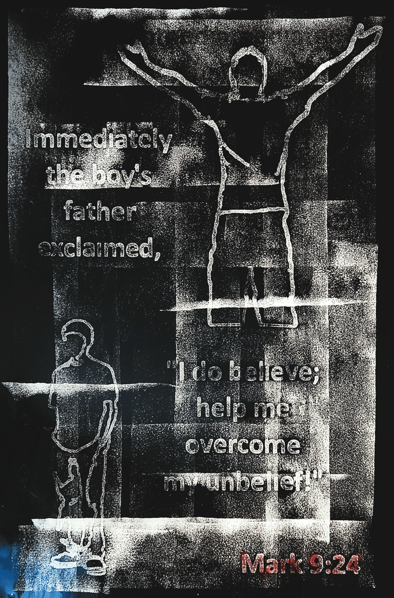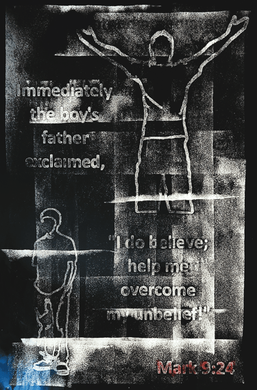 Healed by Jesus, Overcome Unbelief, is a piece of artwork drawing inspiration from Mark, Chapter 9, Verses 14-29