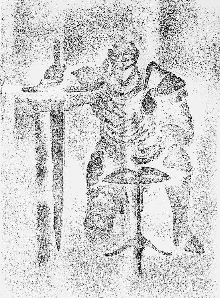 Surrendered and submission are not the same thing. Although the two words have similar meanings, each differs on a very important point – willingness. Whereas submission does not always include acceptance of another’s authority, surrender does. As you enjoy watching the creative process, ask yourself: Are you surrendered to God’s authority? Are you kneeling down before the creator of the universe? Is Jesus the Lord of your life? Is your sword the Sword of the Spirit (Word of God)? Does your sword represent (read: manifest) as the cross which we should all pick up and bare daily? Are you reading your word every day like the surrendered figure in the painting?