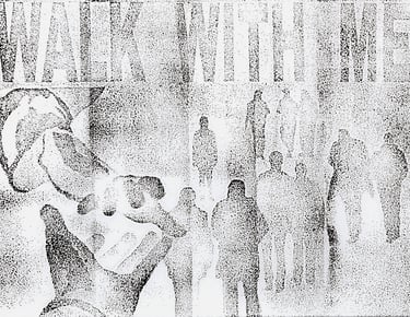 The Walk With Me annual retreat is men taking time to get together, praise, worship, pray, break bread, and dig into scripture. Time is allotted for exploring the challenges each man is individually facing whether they be spiritual, financial, marital, vocational, parental etc., and time is also spent celebrating the victories of life as believers. Members of the Body of Christ should not be alone with their life challenges, they should fellowship with other believers in all they do. The retreat began in 2016 and inspired servant first attended in 2018. Two years later and after some discussion with group leadership, inspired servant created artwork on canvas and an image was inked onto T-shirts. The tradition had been established.